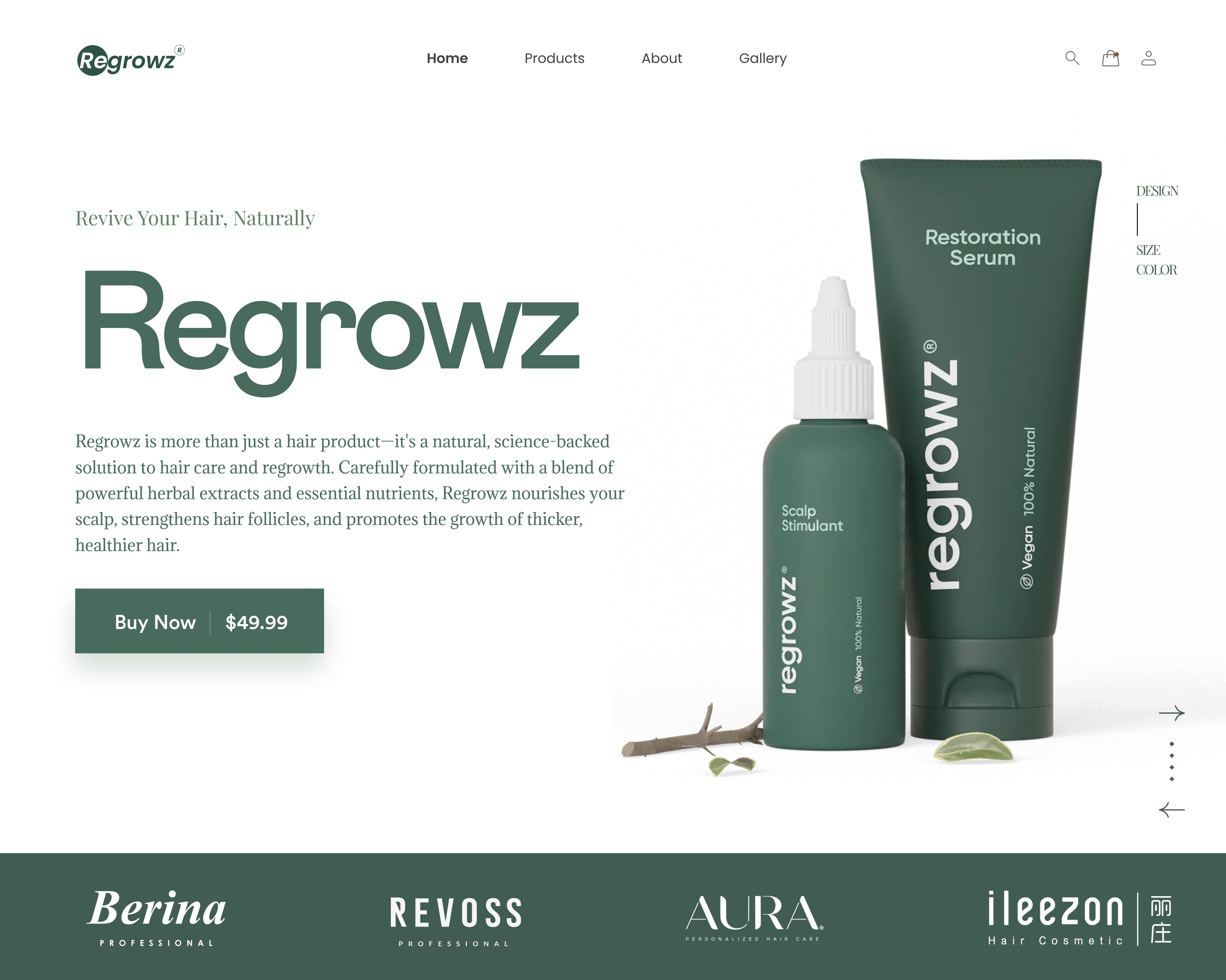 Hair regrowth product landing page with natural, science-backed solutions featuring elegant product photography and trust-building design.