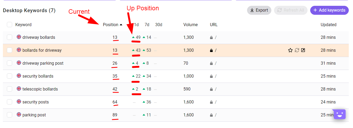 Desktop keyword optimization campaign with significant position improvements - achieving top 15 rankings for high-volume keywords with up to 49 position gains.