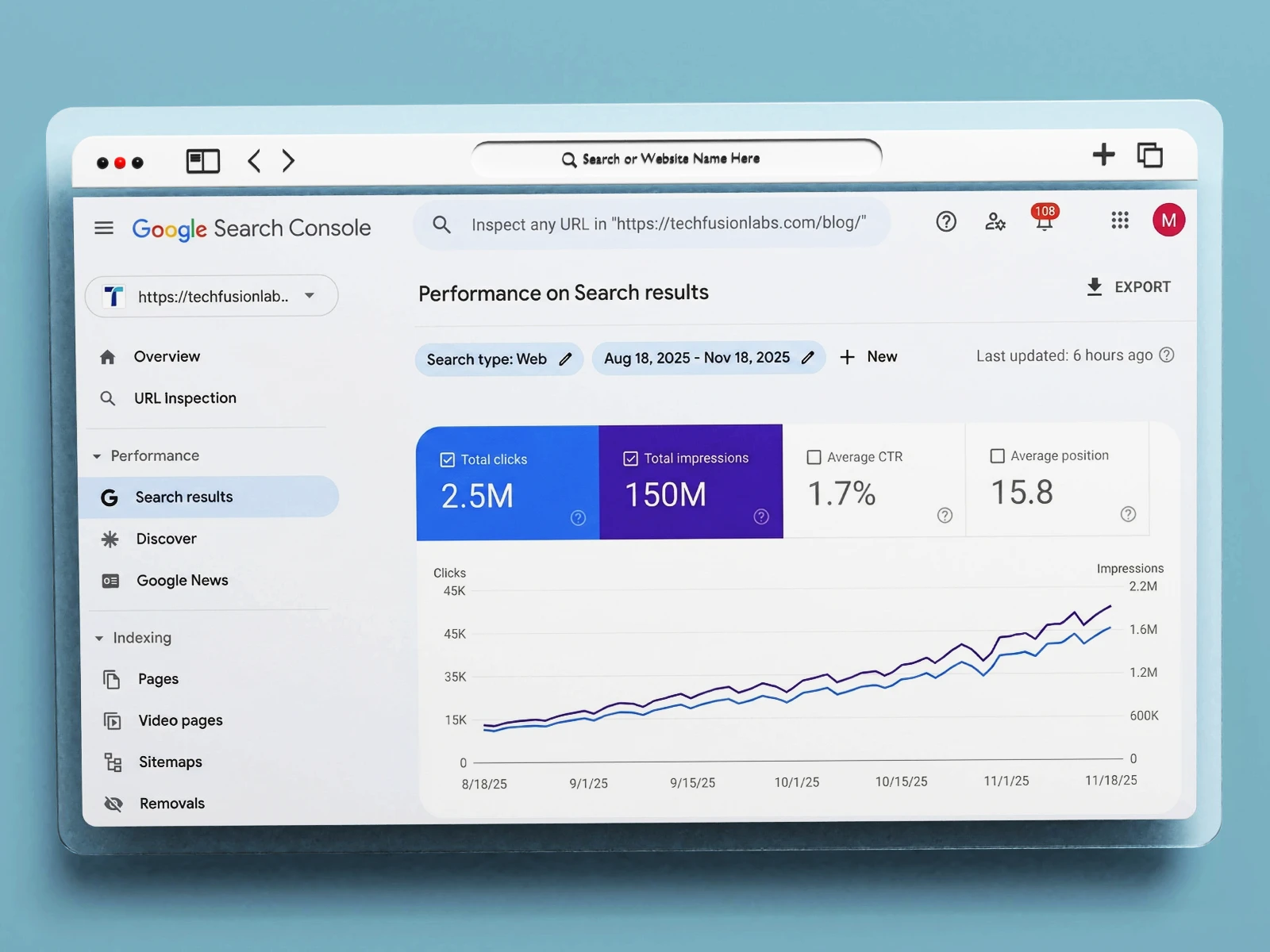 Search performance optimization delivering 2.5M clicks and 150M impressions with improved CTR of 1.7% and average position 15.8.