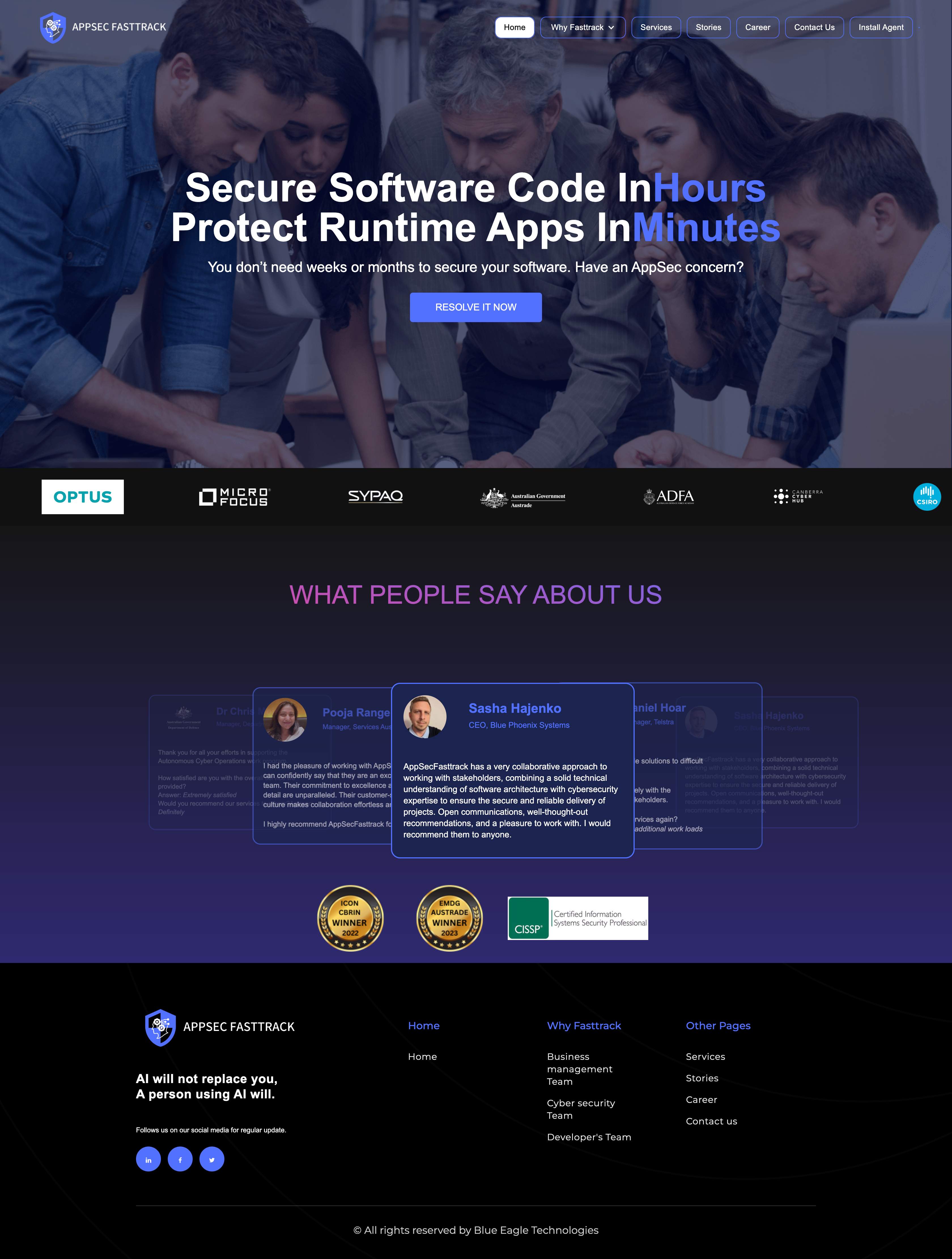 Cybersecurity platform landing page featuring secure software solutions with modern dark design.
