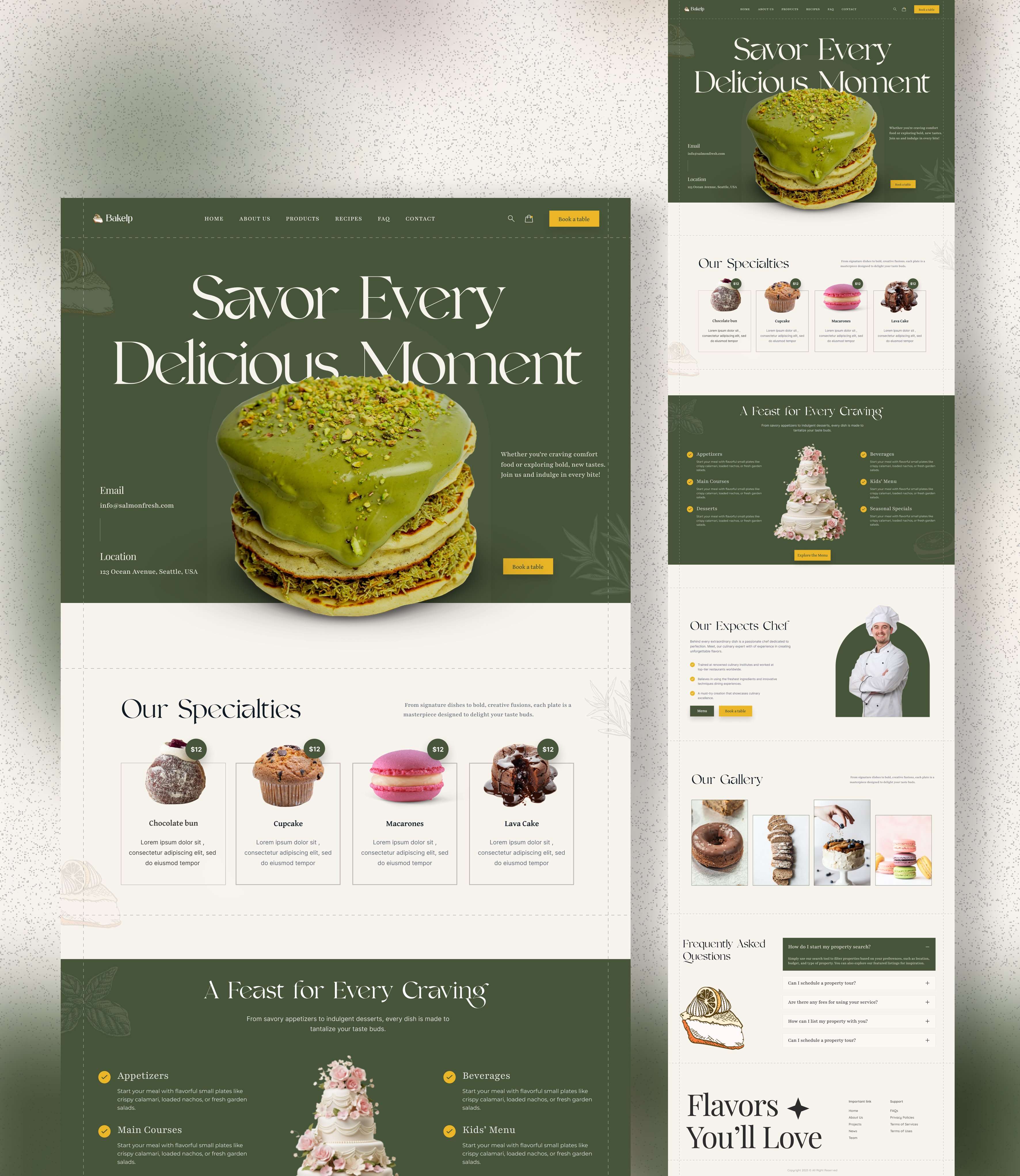 Restaurant and bakery website with green/cream aesthetic, featuring menu displays and table reservations.