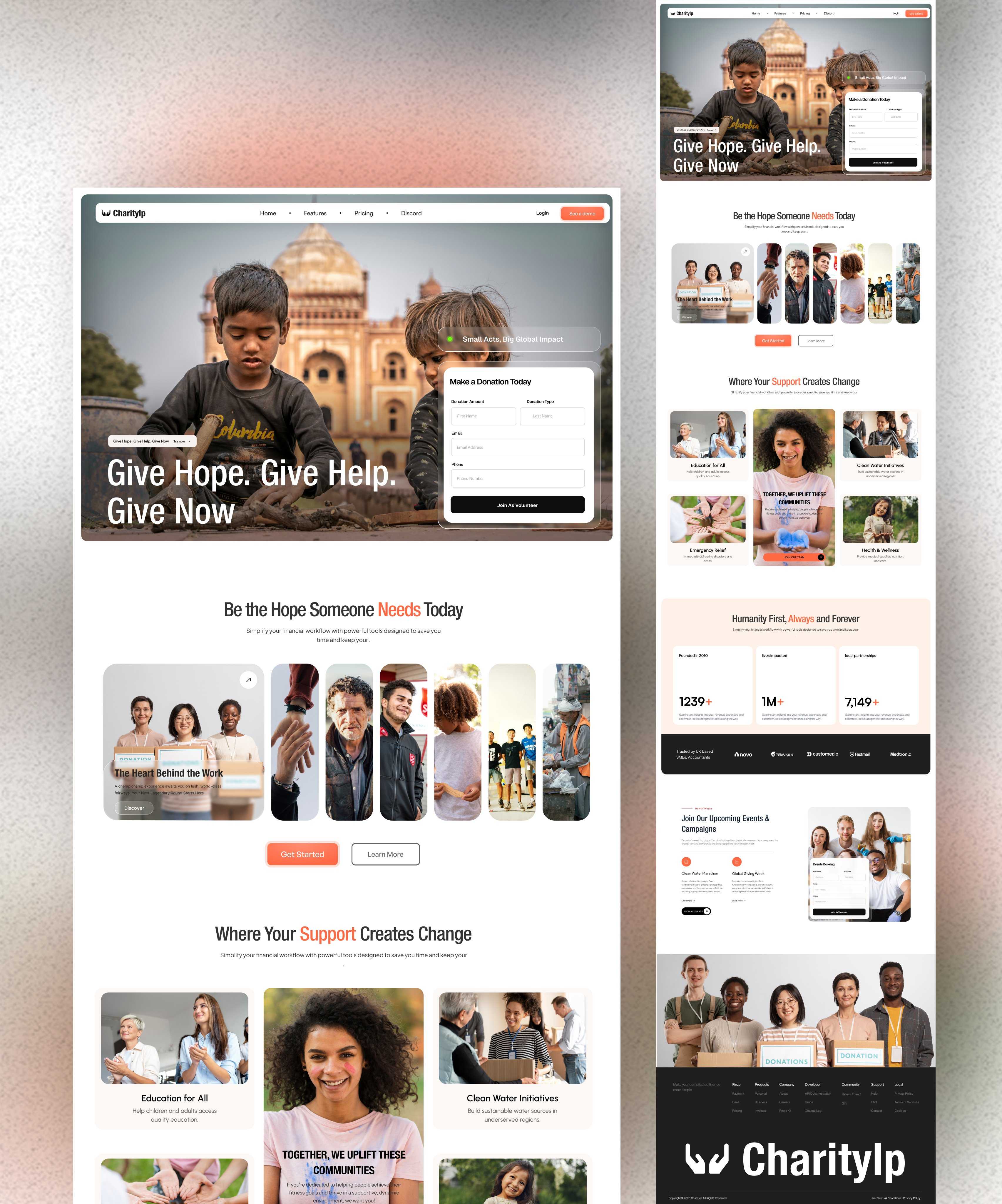 Charity and donation platform with warm community themes, featuring donation forms and impact stories.