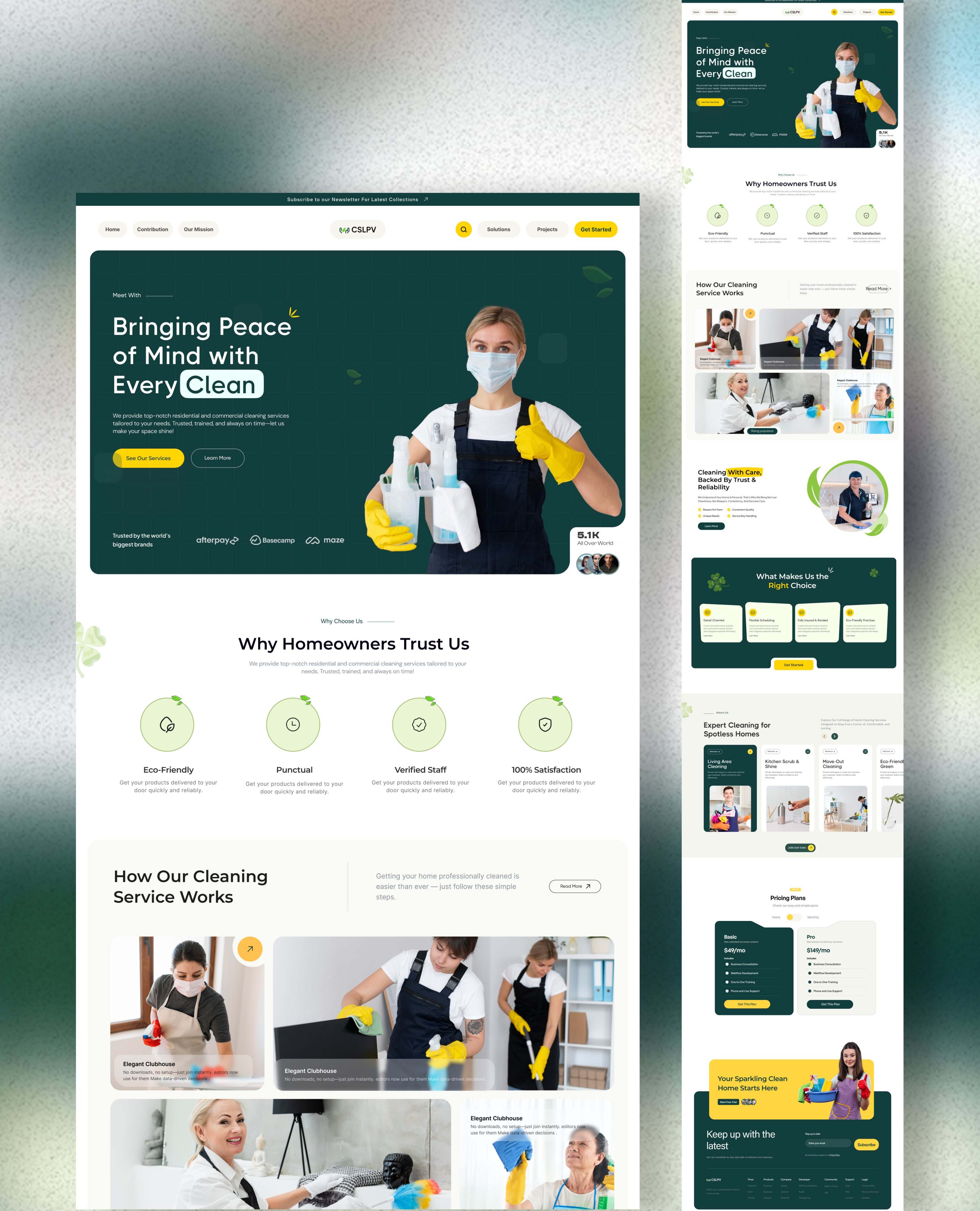 Professional cleaning service website with green eco-friendly design, service booking and trust indicators.