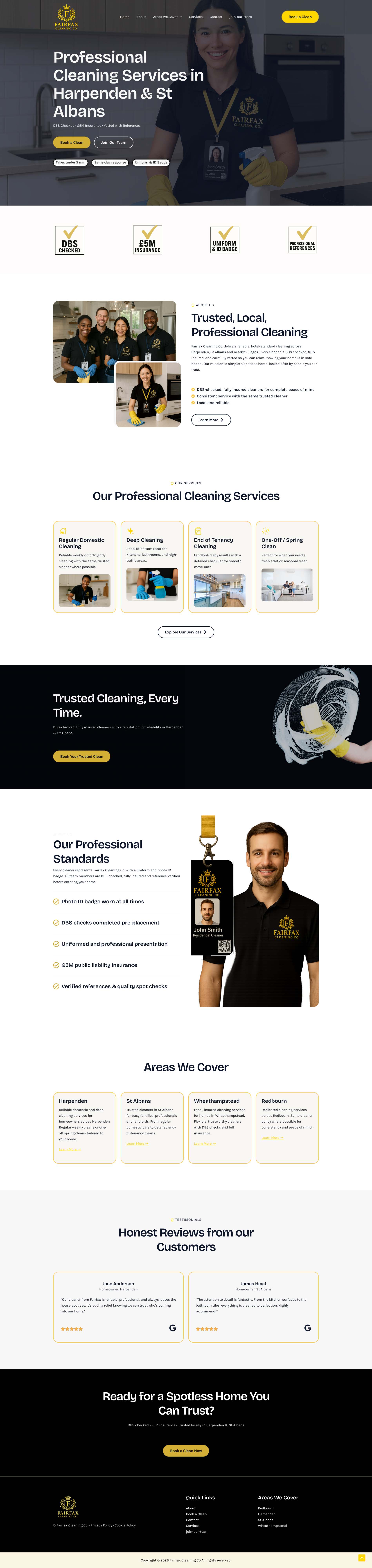 Professional cleaning services website with booking system, service areas, and trust-building testimonials.