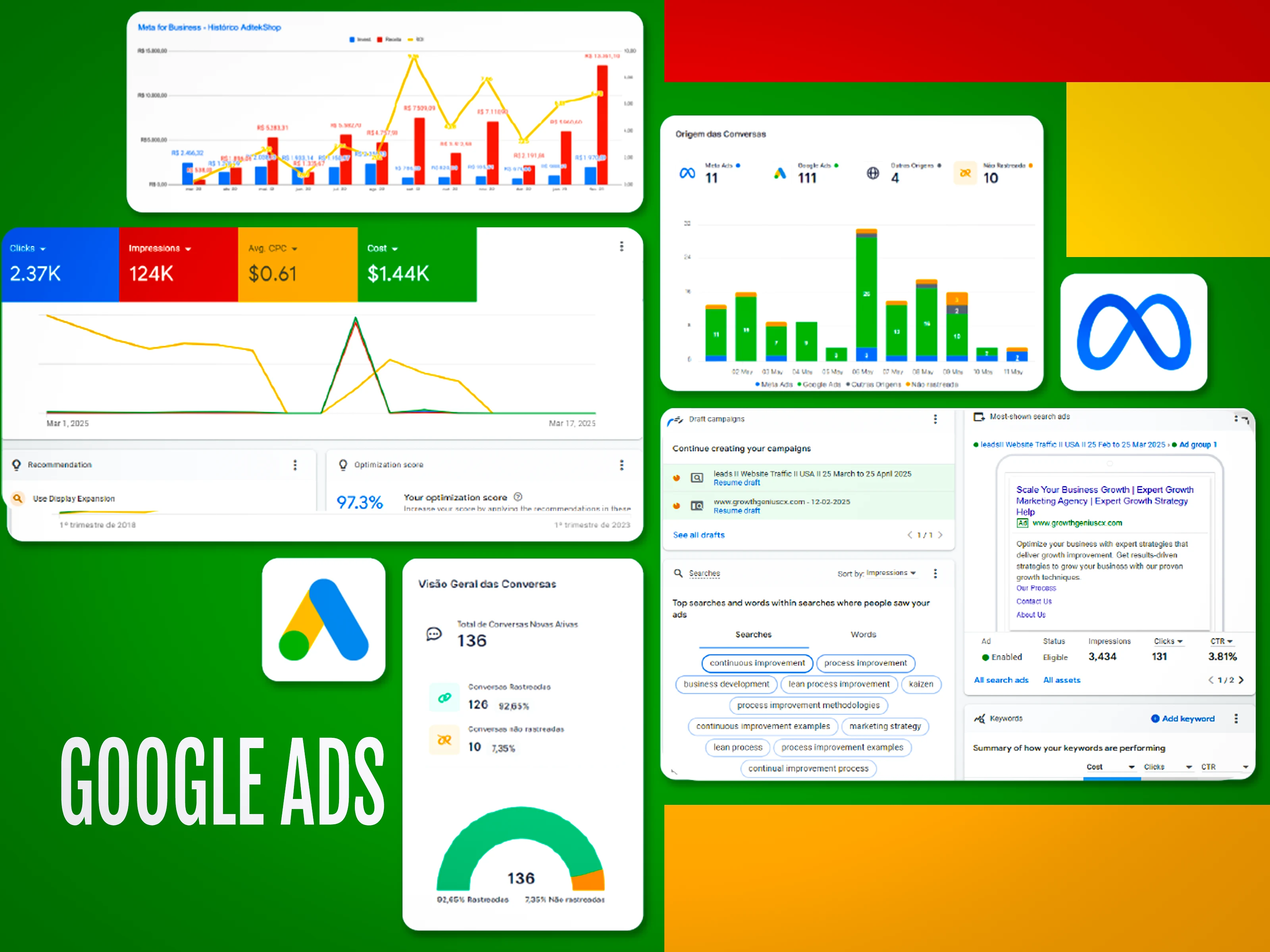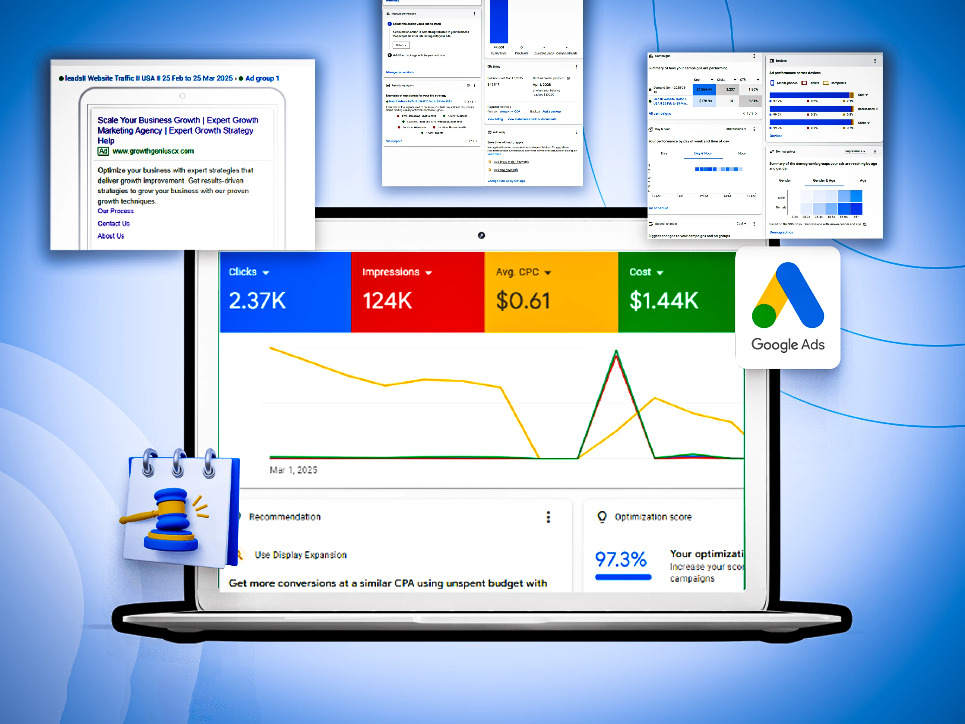 High-performance Google Ads campaign achieving 2.37K clicks, 124K impressions at $0.61 CPC with 97.3% optimization score.