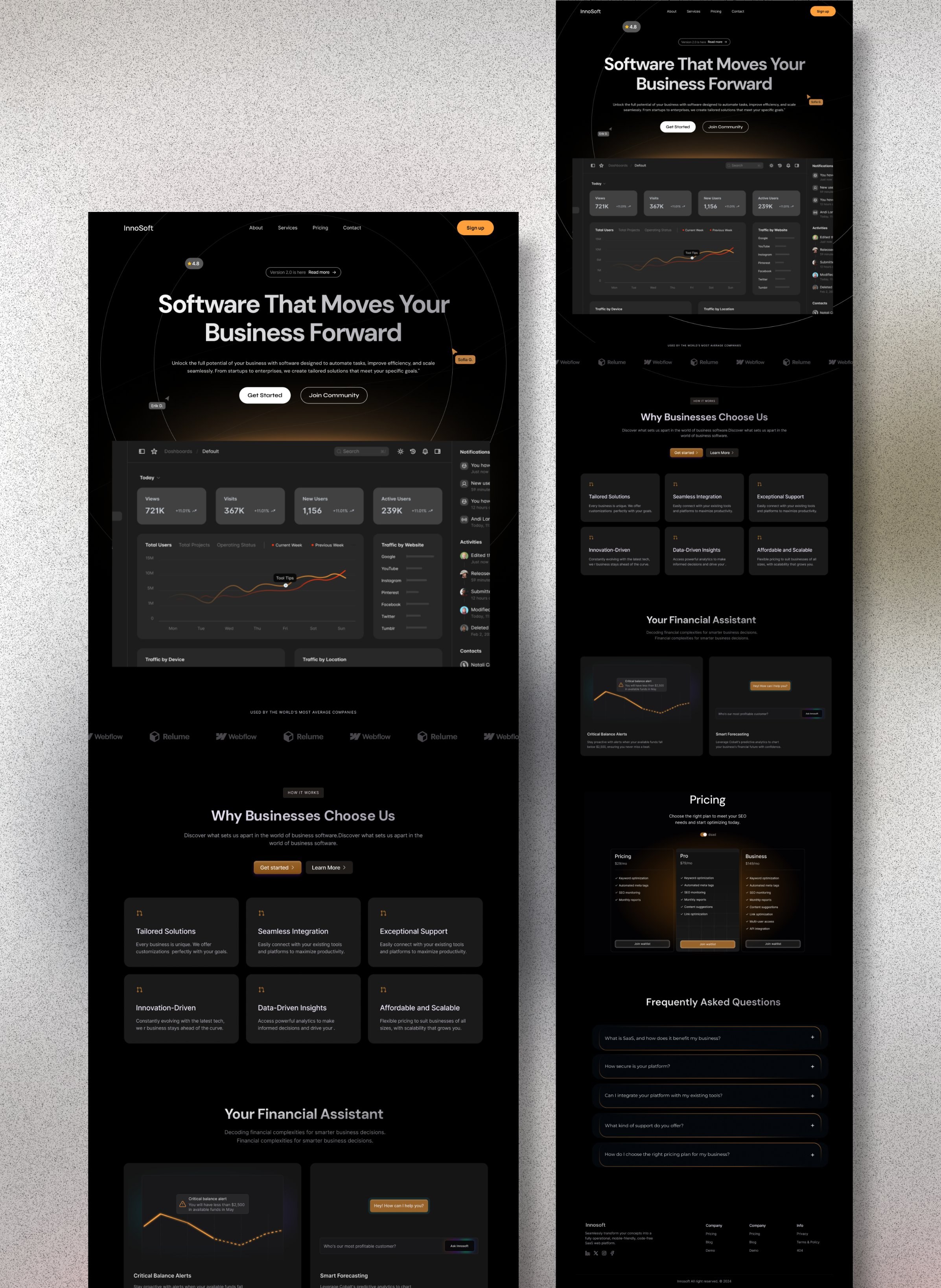 Modern dark-themed SaaS landing page with dashboard preview, designed for business automation software.