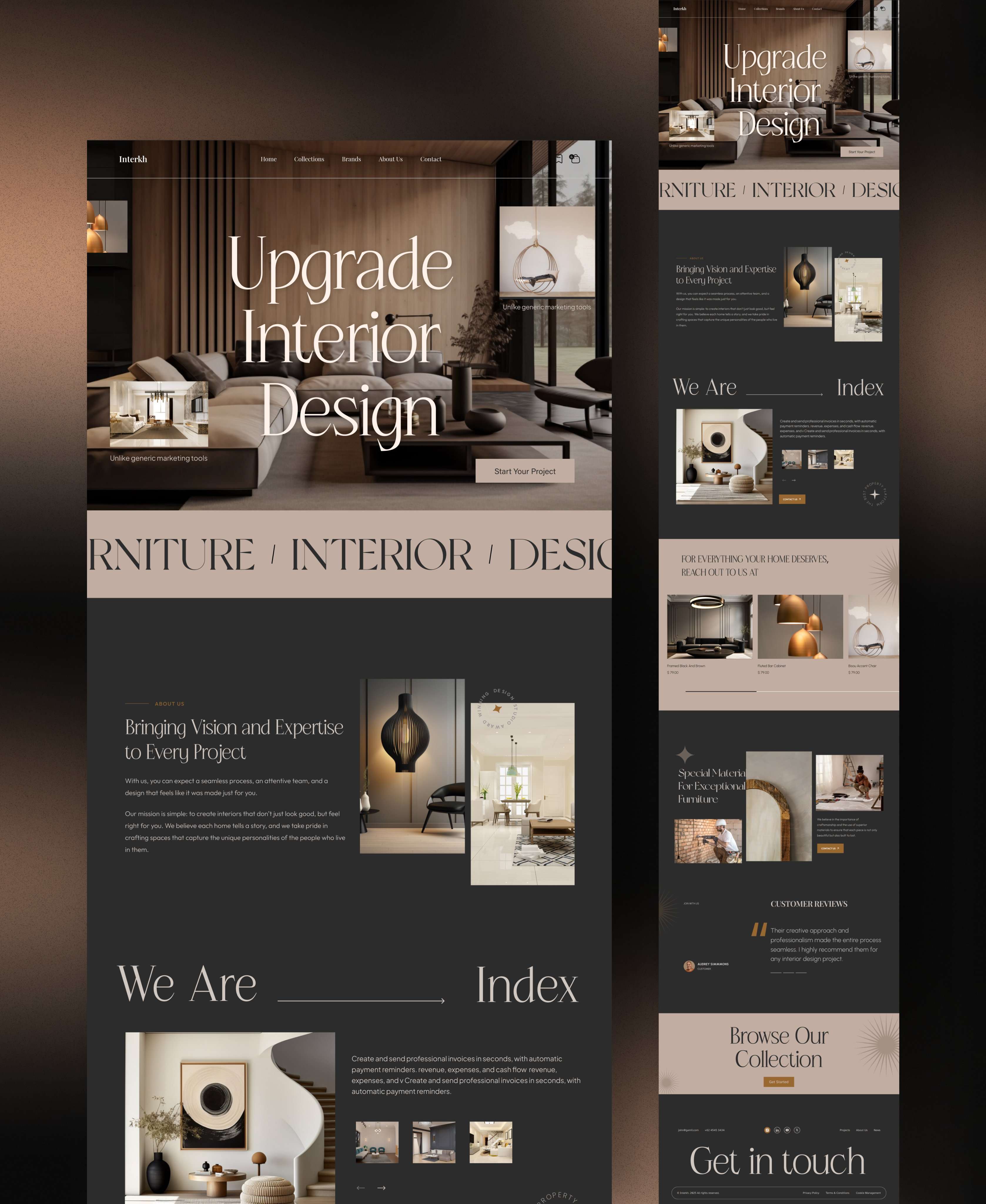 Luxury interior design website with dark/gold aesthetic, featuring elegant furniture showcases and premium styling.