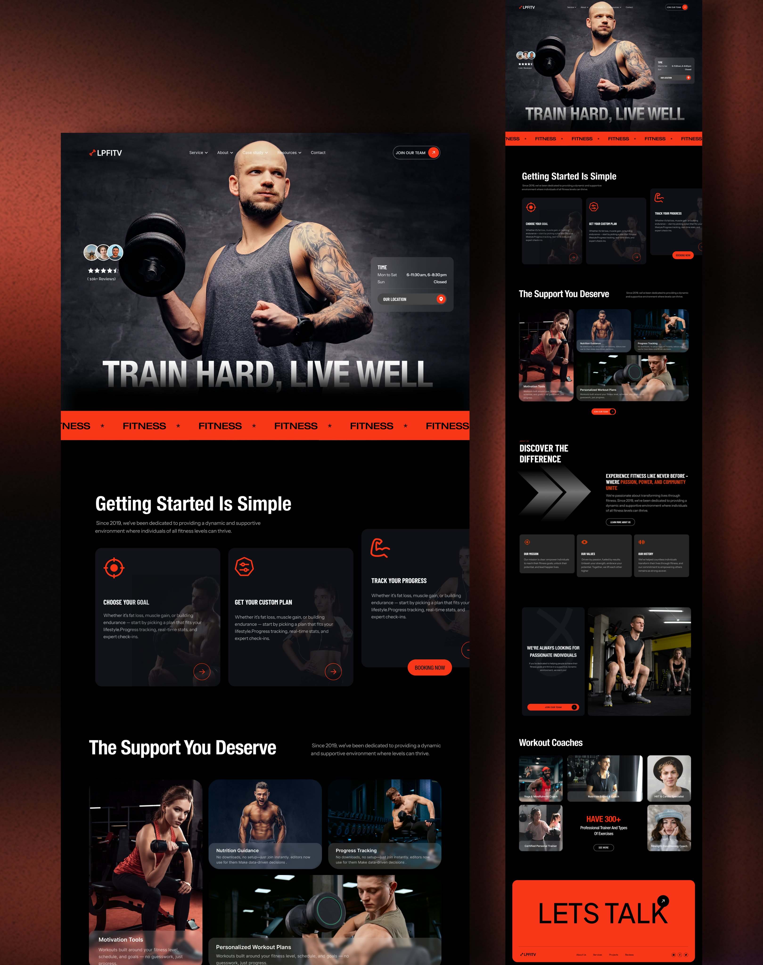 Dark-themed fitness and gym website with red accents, featuring workout programs and trainer profiles.