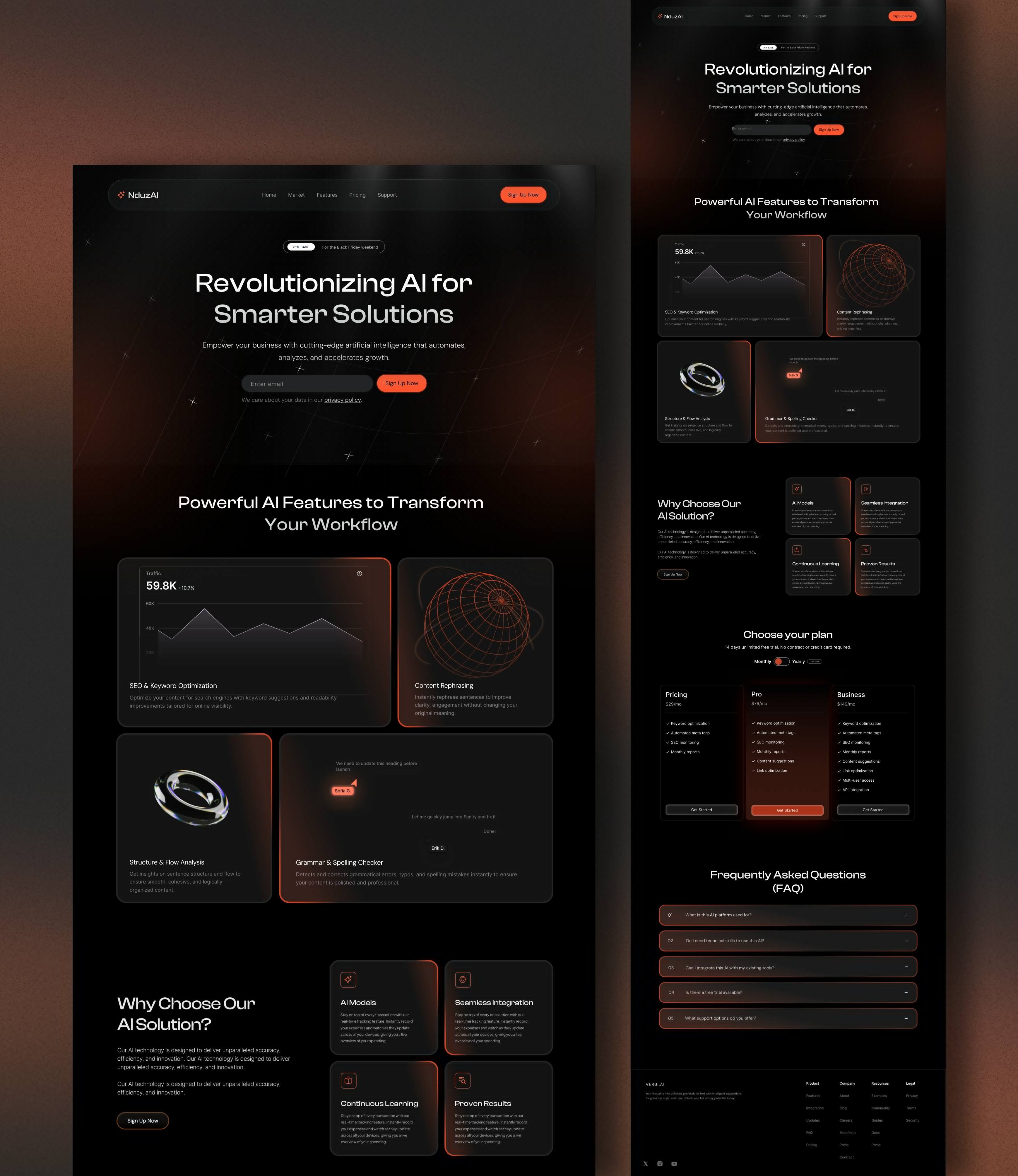 AI platform landing page with SEO optimization, content tools, and smart workflow automation features.