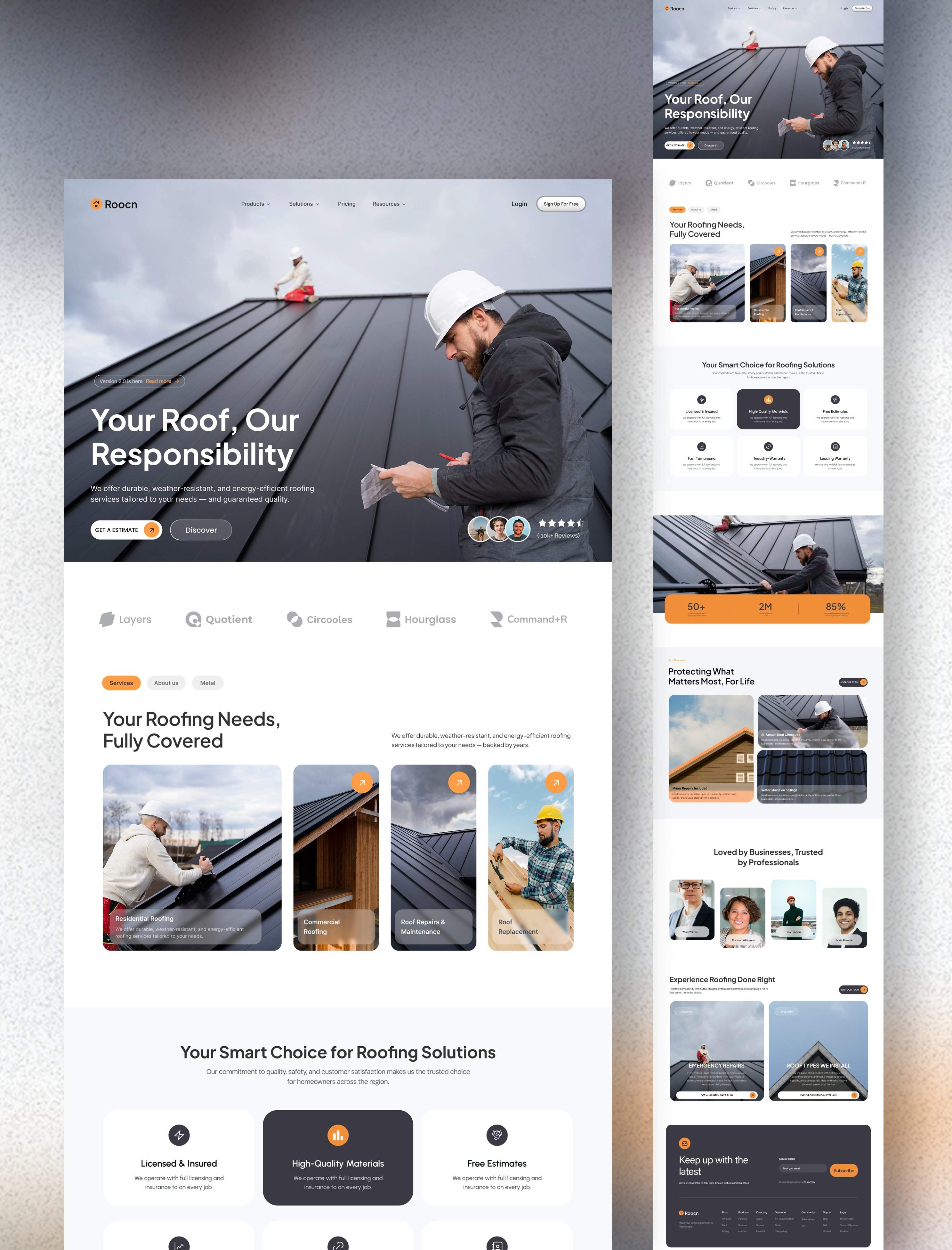Roofing services website with orange accents, featuring service areas, estimates and customer testimonials.