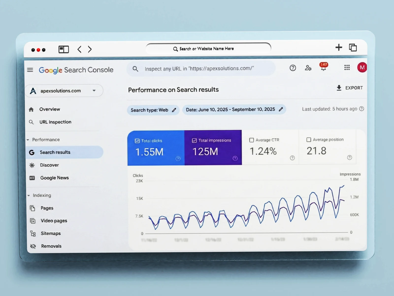 Search engine optimization delivering 1.55M clicks and 125M impressions with 1.24% CTR for B2B solutions company.