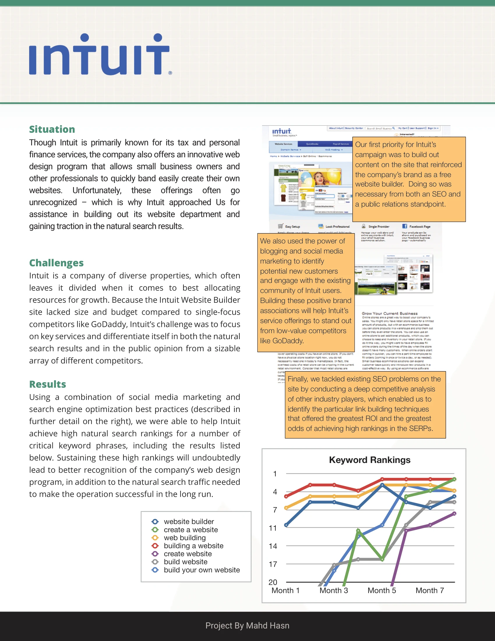 Enterprise SEO strategy for Intuit website builder program, achieving high rankings for competitive keywords through content and technical optimization.
