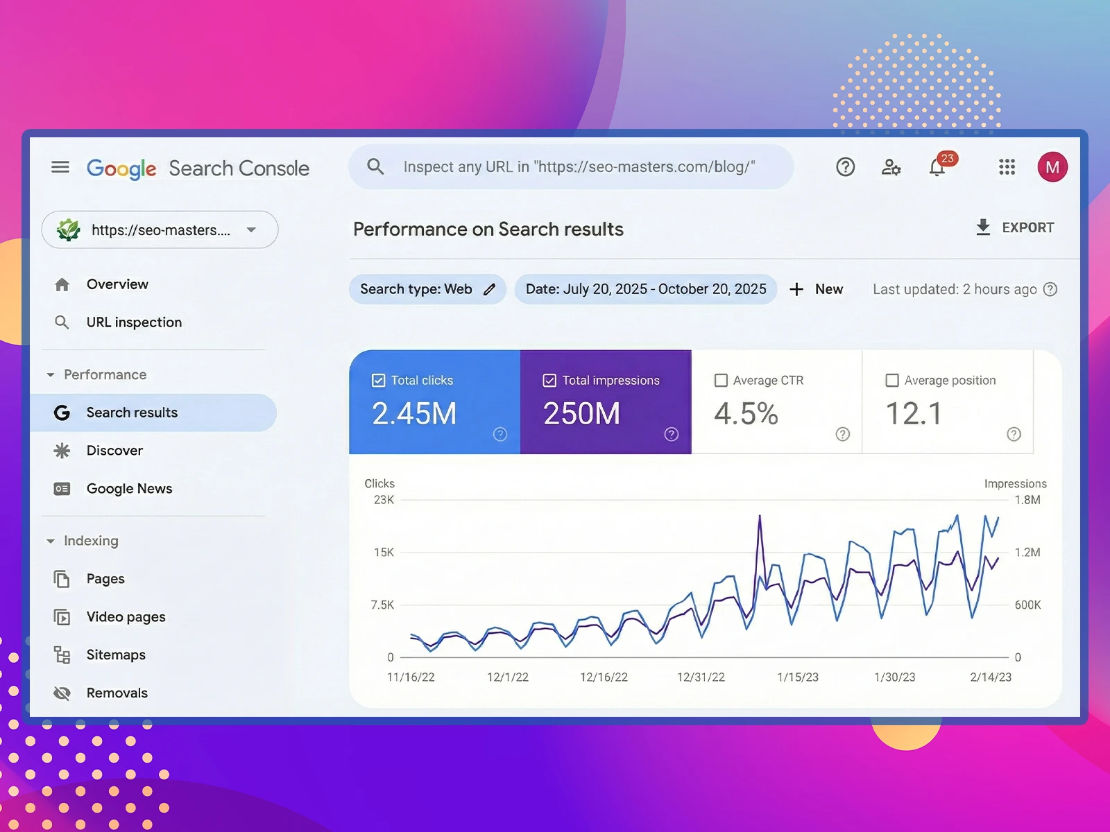 Outstanding SEO performance with 2.45M clicks and 250M impressions, achieving exceptional 4.5% CTR with average position 12.1.